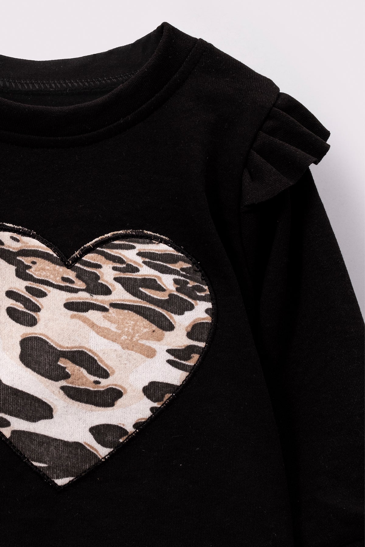 This beige 2-piece set features a soft, comfortable top and matching bottoms adorned with a charming leopard print heart detail....